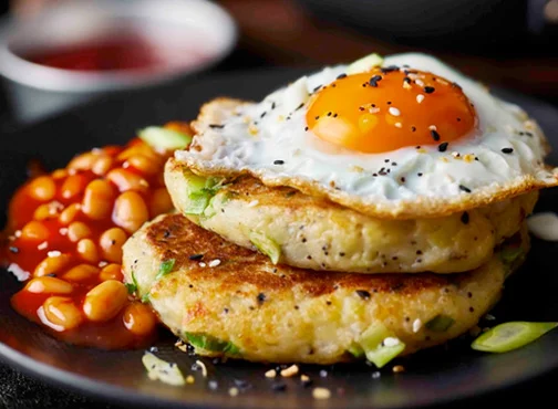 Use up leftover mashed potato in these wallet-friendly cheesy spring onion potato cakes, served with fried eggs and smoky beans.