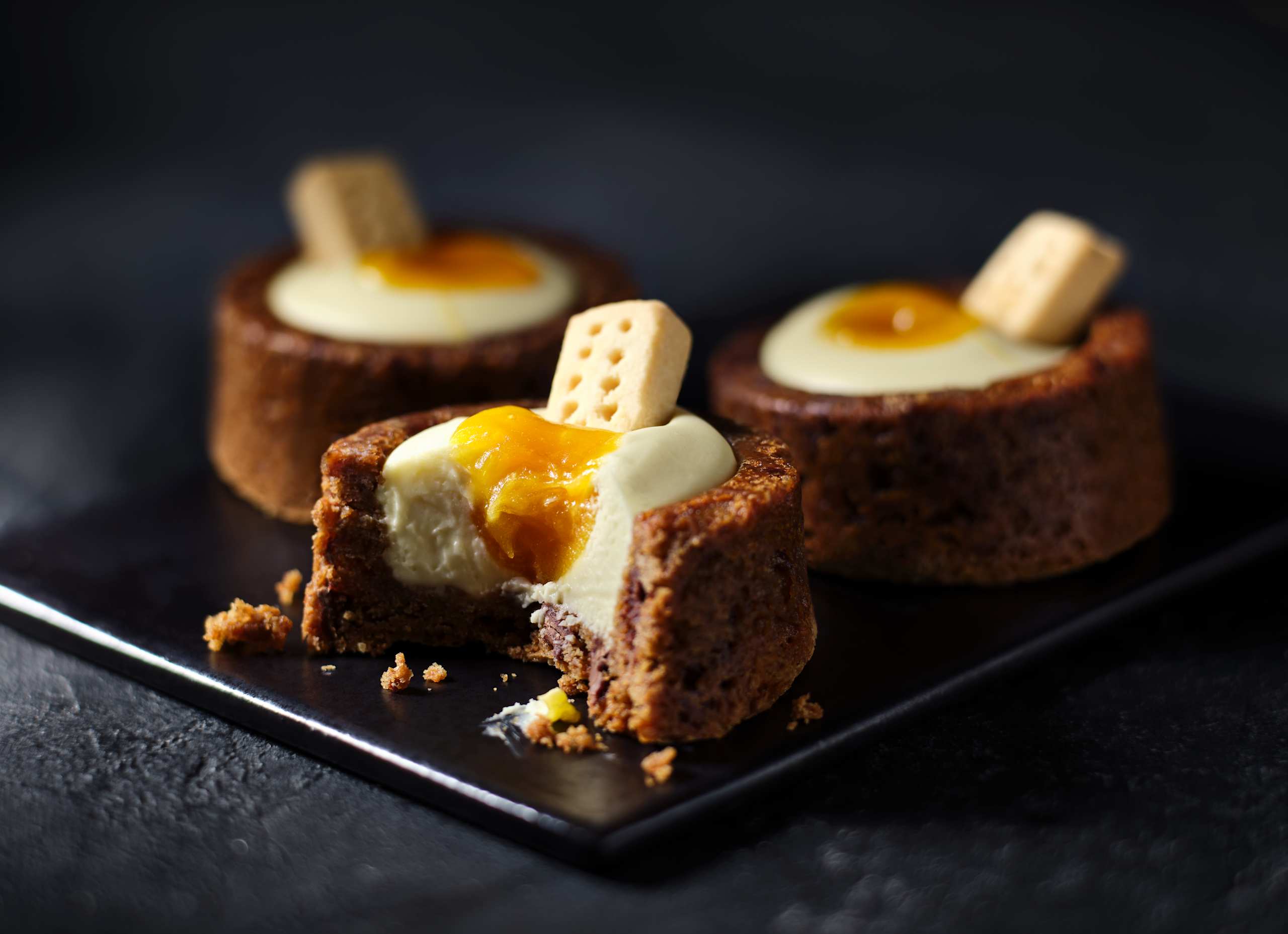 Our Dippy Egg Cookie Cup is an Easter showstopper: a chewy milk chocolate chip cookie cup filled with white chocolate cheesecake, topped with zesty mango and passion fruit compote, and served with an all-butter shortbread biscuit.