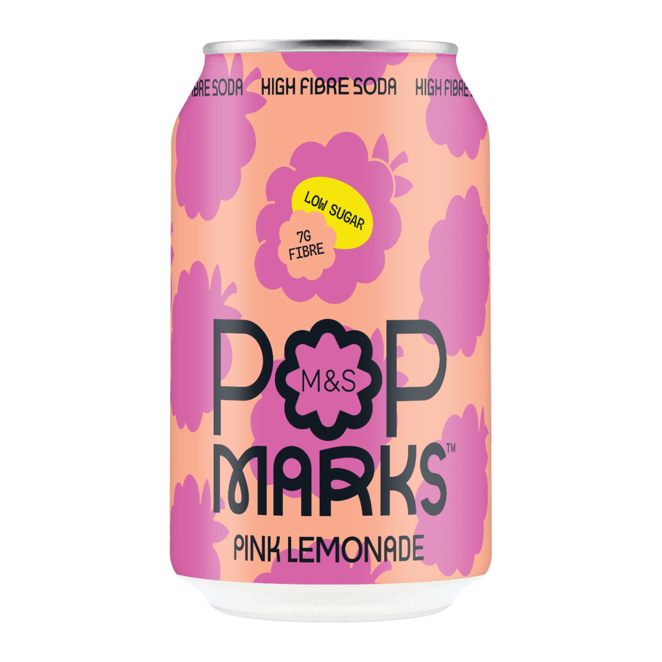 Pop Marks Pink Lemonade is made with grape and lemon juices, raspberry purée and fibres. Tangy with a berry finish, it’s a refreshing high-fibre, low-sugar carbonated drink.